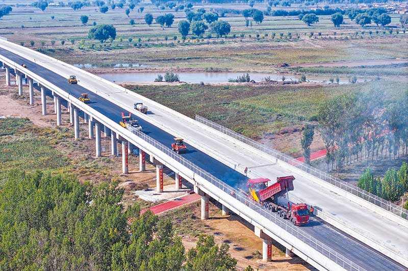 工人在241國道平遙段新建汾河大橋施工現(xiàn)場鋪設瀝青路面